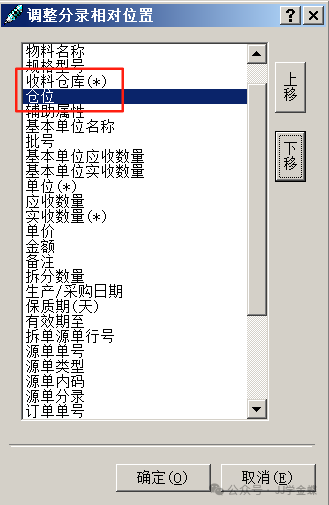 d、通过“调整分录位置”将新增的“仓位”列调整到“收料仓库”后面然后点击“确定”。