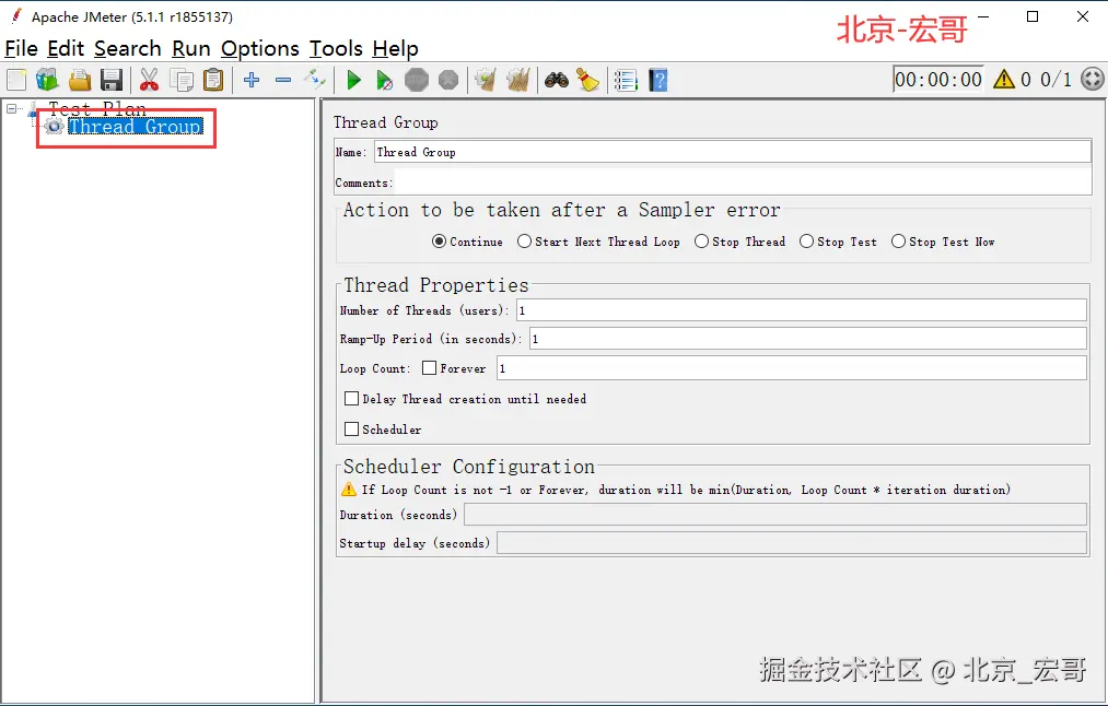 最后,你需要修改默认属性(如果需要修改,不需要修改默认即可)。如果尚未选择线程组元素,则在树中选择它。那么你就可以在“ JMeter”窗口的右侧部分中看到“线程组控制面板”,如下图所示: