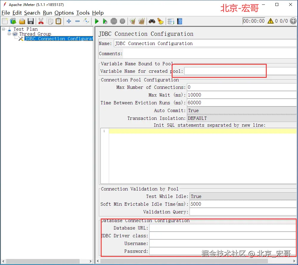JMeter使用“控制面板”中指定的配置设置创建数据库连接池。在“ 变量名 ”字段的JDBC请求中引用该池。可以使用几种不同的JDBC Configuration元素,但是它们必须具有唯一的名称。每个JDBC请求必须引用一个JDBC配置池。一个以上的JDBC请求可以引用同一个池。