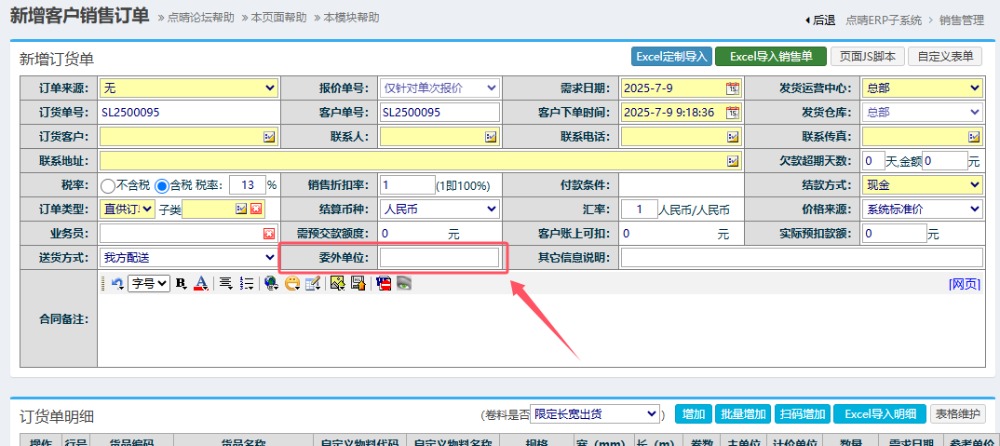 以上就可以对销售订单主表增加自定义字段了,重新进入销售订单新增页面,就会看到多了一个字段“委外单位”: