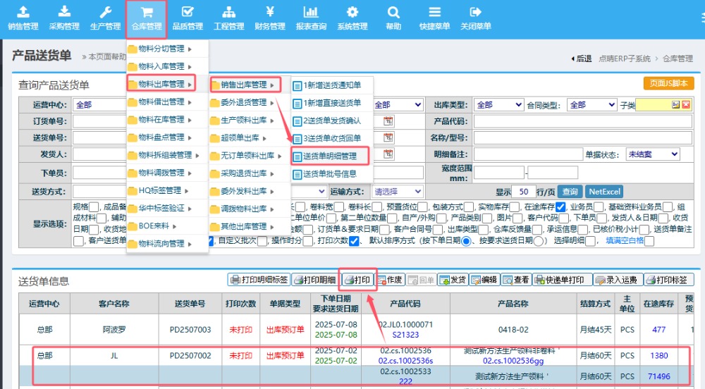 还是以管理员身份登陆点晴ERP系统-》仓库管理-》物料出库管理-》销售出库管理-》送货单明细管理