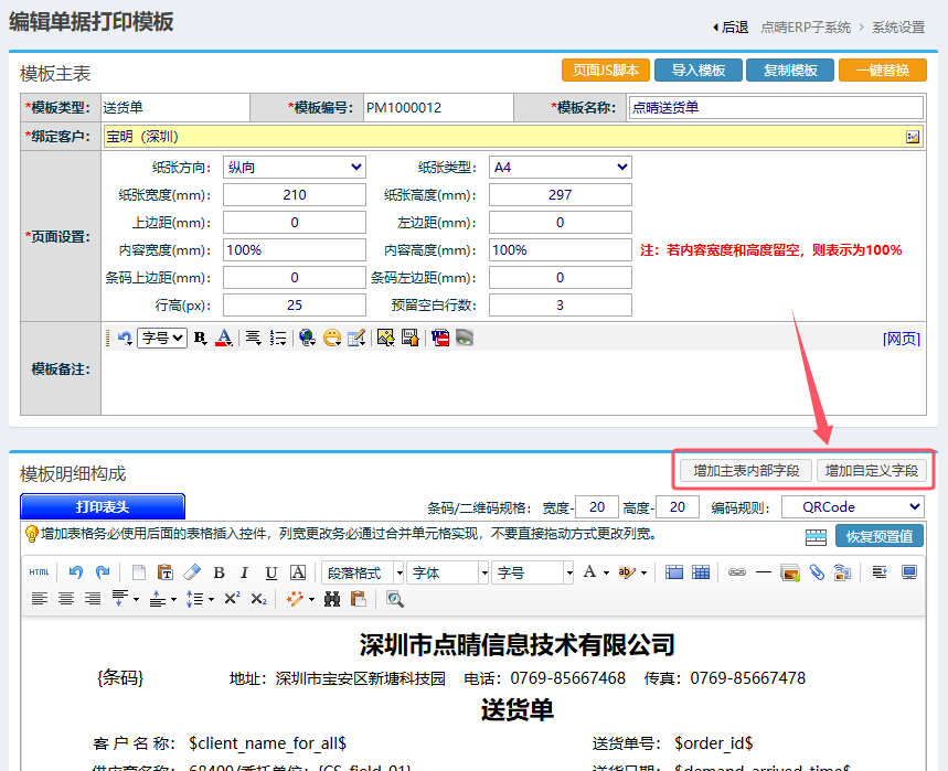 在打印模板设置页面中,提供了两个增加自定义字段的按钮:增加主表内部字段增加自定义字段