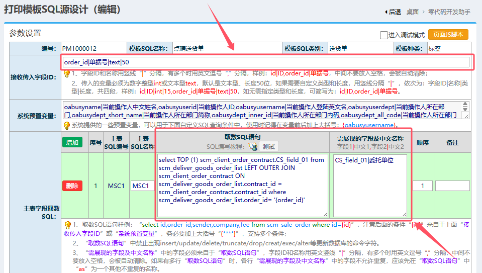 在“传入字段ID”中,输入“order_id|单据号|text|50”,这个是用于根据送货单号唯一识别出自定义字段的关键信息;
