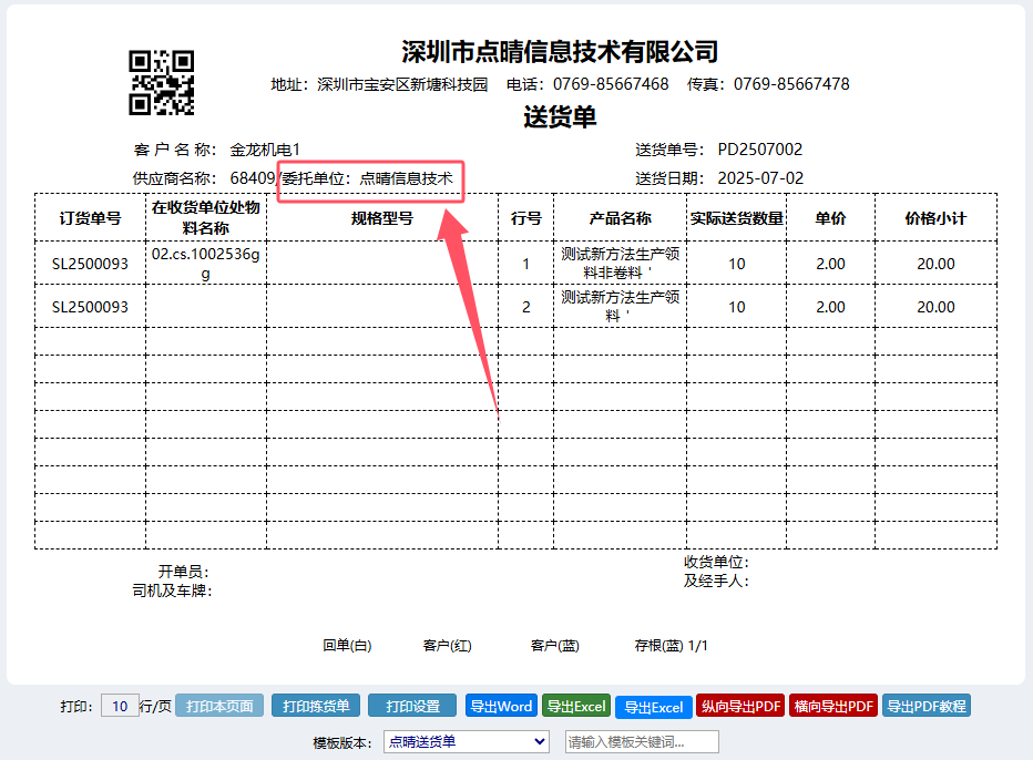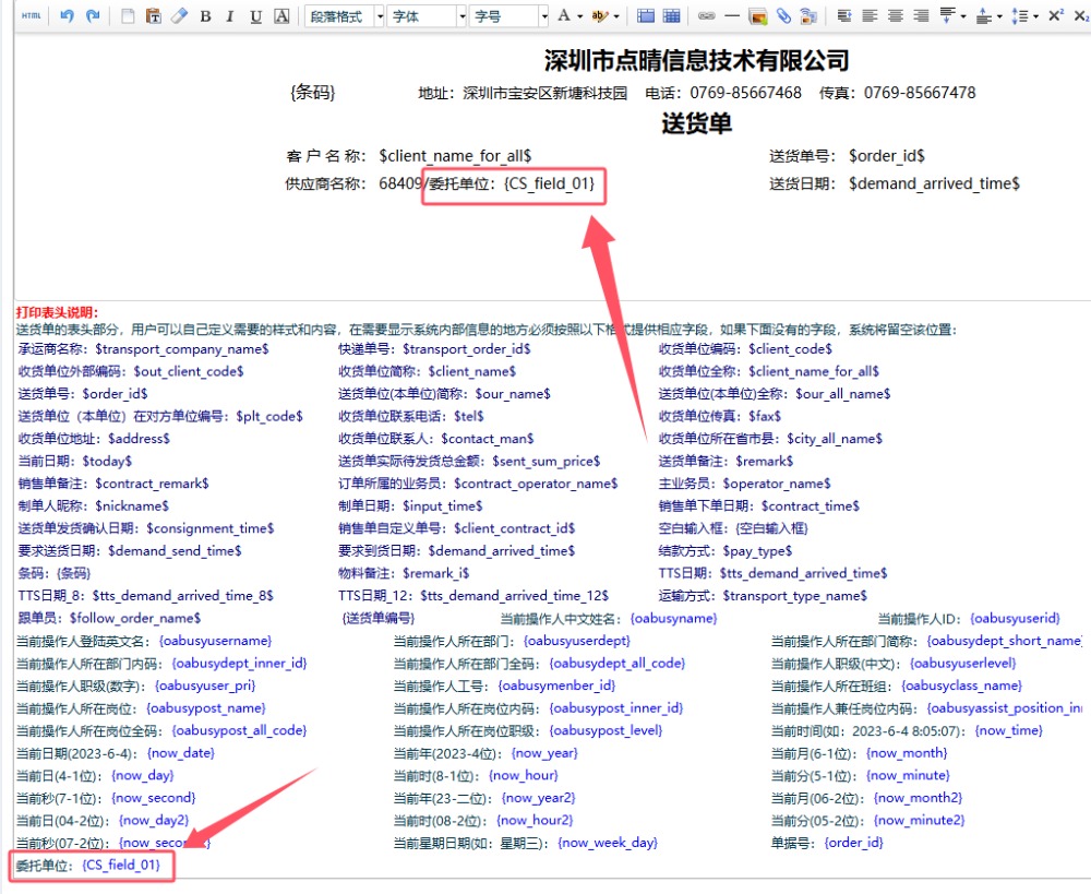 ​就会看到下面多了一个“委托单位:{CS_field_01}”,将其放到打印模板上适当位置,打印时,就会看到多了这个自定义字段了: