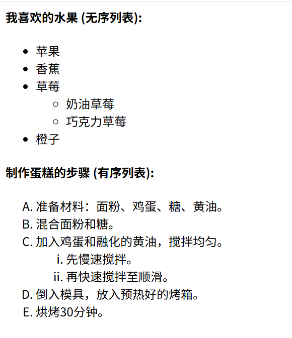• HTML 允许在一个<li>列表项内部再嵌套另一个<ul><ol>列表,从而创建出具有层级结构的子列表或多级列表。这对于组织复杂信息非常有用。