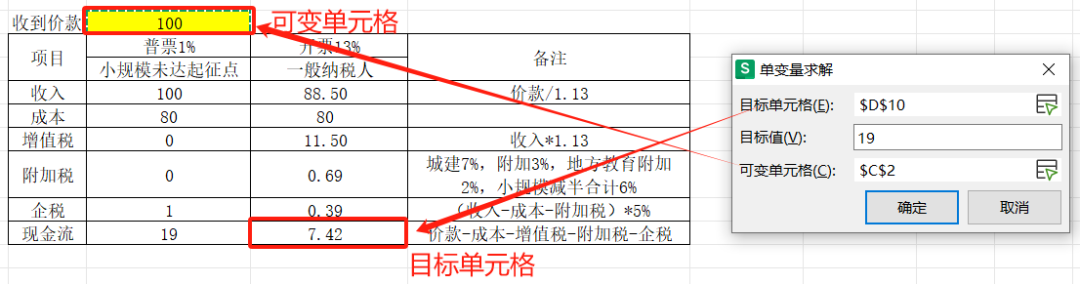 通过单变量求解,计算后价款为113.89,加税点13.89。