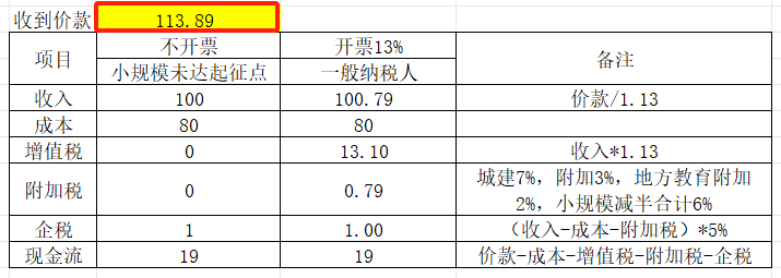 通过对比可以发现,不开票现金流实际是20,开票导致多交税致使现金流变为18,因此需要多收一些价款来弥补这部分损失。