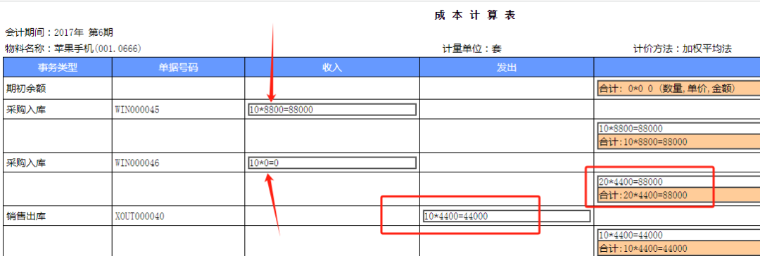 那么加权平均后的单价就是88000/10+10)=4400块的单价,那出库成本单价就是4400元了,剩下的成本单价也是4400,通过这个成本计算表,我们就能知道是什么单据,那个单据号码的单没有填入库单价,去查询单据填了单价后再进行核算就会是成功的