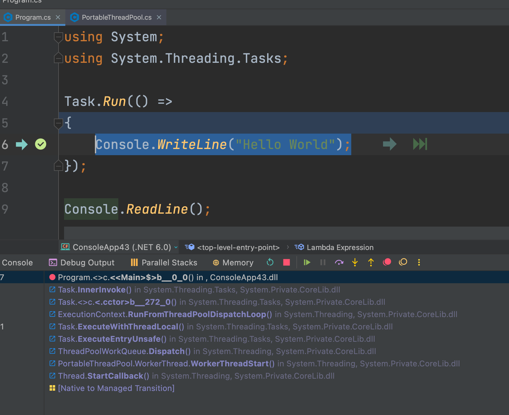 在 PortableThreadPool.TryCreateWorkerThread 和实际要要执行的 lambda 表达式中打上断点,我们便可以清晰的看到整个执行过程。