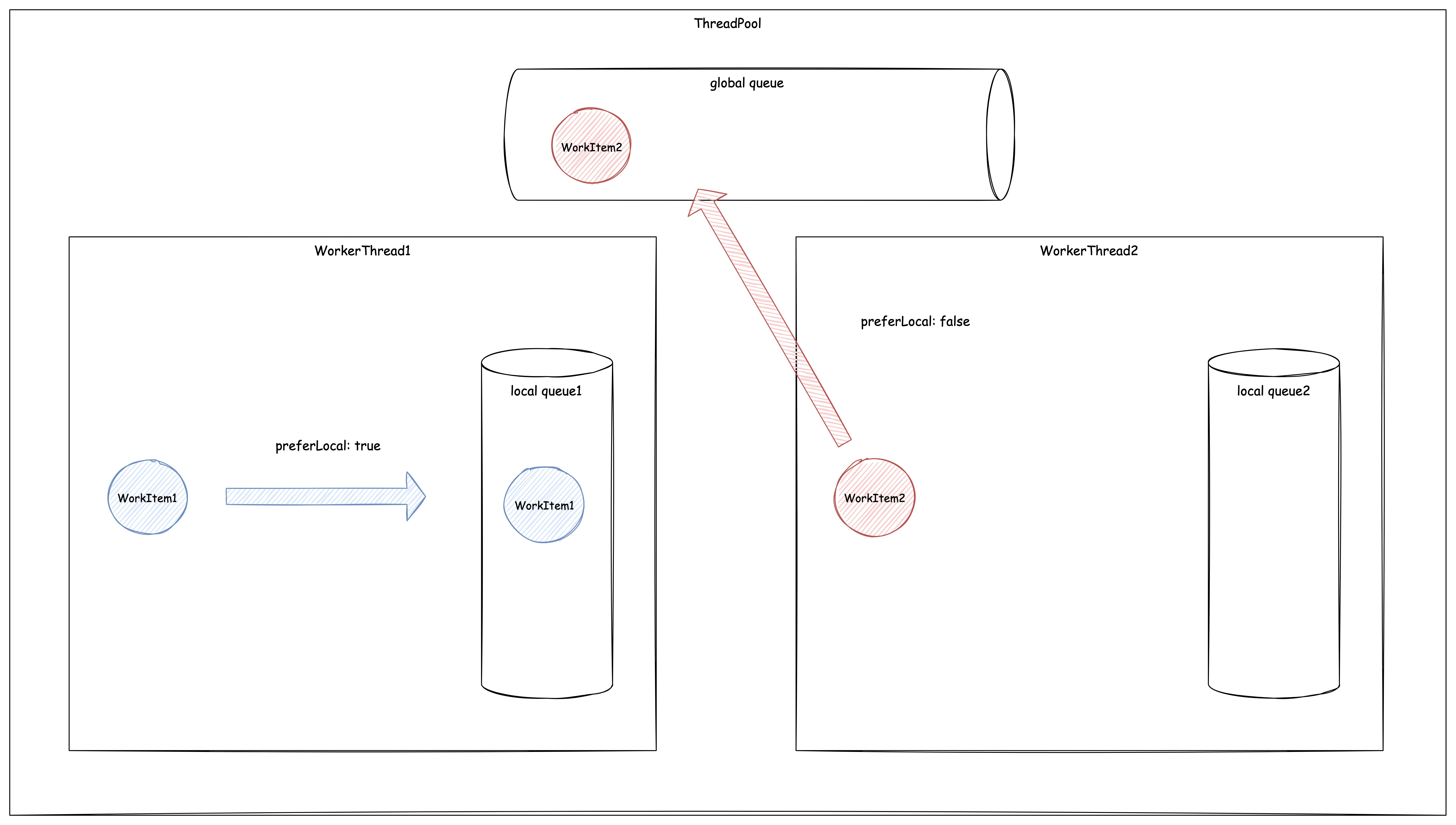 当 preferLocal 为 true 的时候,如果调用 ThreadPool.QueueUserWorkItem 代码的线程正好是个线程池里的某个线程,则该任务就会进入该线程的本地队列中。除此之外的情况则会被放到全局队列中等待未来被某个 Worker Thread 捡走。
