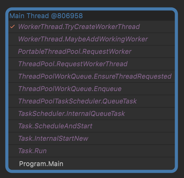 其实 ThreadPoolWorkQueue 维护的 NumOutstandingThreadRequests 这个值会在线程池线程真正跑起来之后,会在 ThreadPoolWorkQueue.Dispatch方法中 -1。也就是说,只要有一个线程真正运行起来了,就能创建第 Environment.ProcessorCount + 1 个Thread。当然,在向 ThreadPoolWorkQueue 加入第13个任务的时候,第13个 Worker Thread 就算不允许创建也没关系,因为任务已经入队了,会被运行起来的 Worker Thread 取走。
