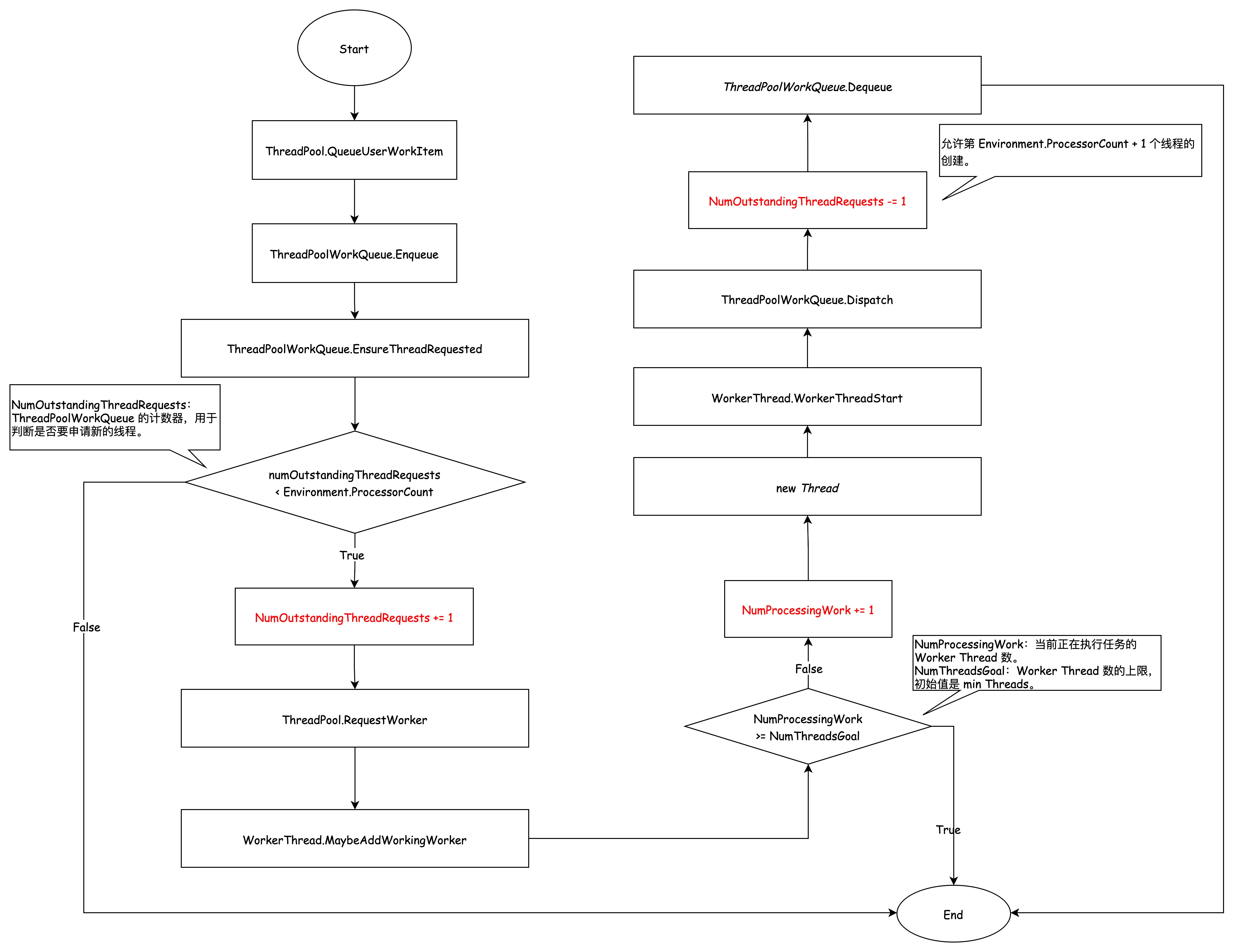 细心的朋友会发现上面代码里 EnsureThreadRequested 方法有一个终止条件,_separated.numOutstandingThreadRequests == Environment.ProcessorCount,每次新增一个 ThreadRequested,这个数就会 +1,似乎允许创建的最大 Worker Thread 是 Environment.ProcessorCount?