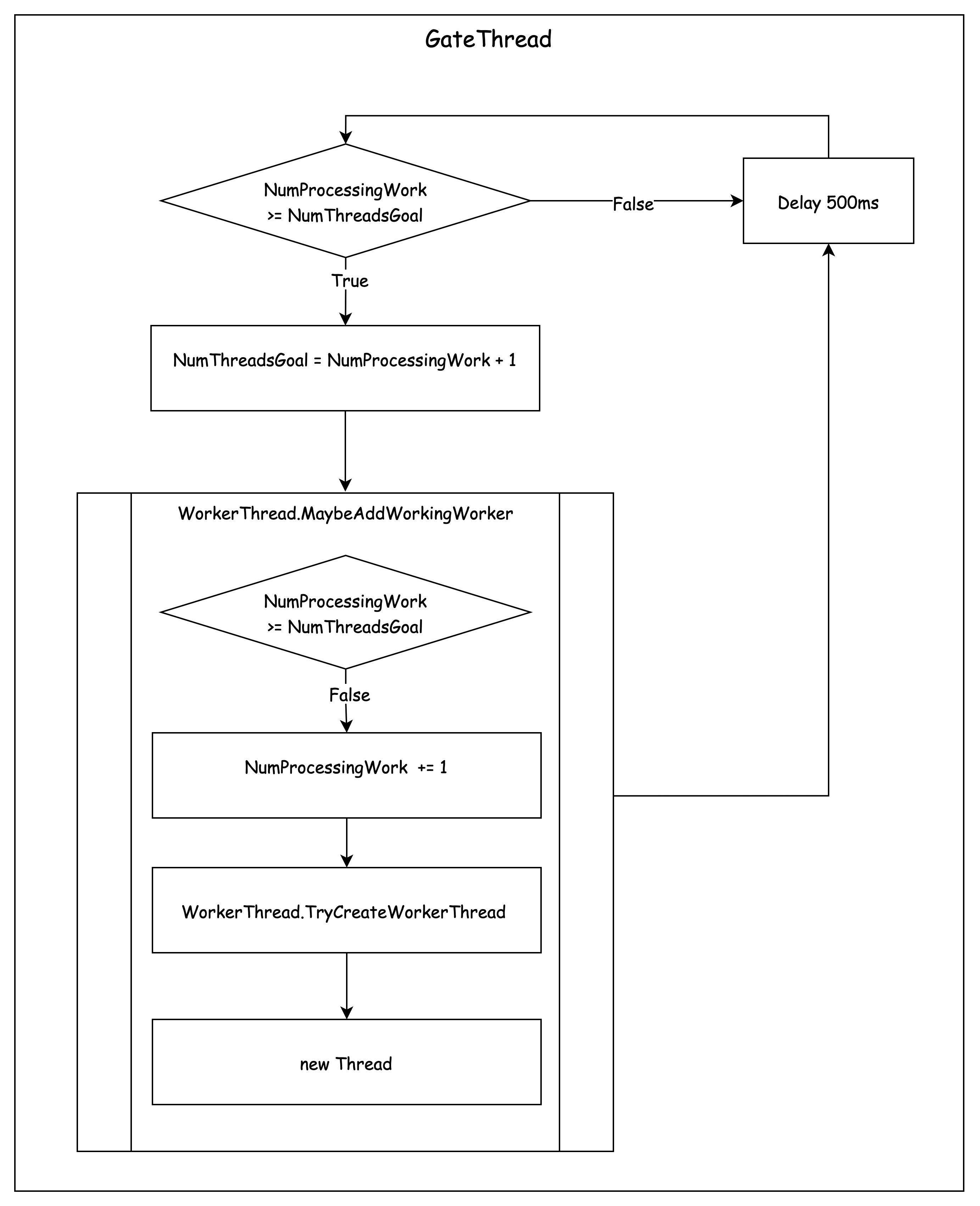 在 GateThread 是一个独立的线程,每隔 500ms 进行检查一下,如果 NumProcessingWork >= NumThreadsGoal(WorkerThread.MaybeAddWorkingWorker 不添加 Worker Thread 的判断条件),就设置新的 NumThreadsGoal = NumProcessingWork + 1,并调用 WorkerThread.MaybeAddWorkingWorker,这样新的 Worker Thread 就可以被 WorkerThread.MaybeAddWorkingWorker 创建。