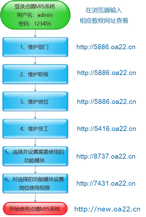 初次使用一定要仔细查看下面内容: 点晴OA协同办公管理信息系统安装后,初次登陆用户账号:admin、密码:123456,第一次进入后会强制要求更改密码,以后进入时密码就是您设置的新密码,而不是123456了!重置密码参见:http://8904.oa22.cn; 点晴OA协同办公管理信息系统V6.0介绍.pdf:下载 点晴OA初次使用视频简介以及初次使用疑问汇总:http://8237.oa22.cn 初次使用视频教程:http://v1.oa22.cn 点晴OA实施上线三部曲:http://10595.oa22.cn 点晴OA部门/岗位/职级/员工设置:http://5886.oa22.cn 点晴OA创建新员工账号:http://5416.oa22.cn 点晴OA功能模块选择设置:http://8737.oa22.cn 点晴OA系统用户权限设置:http://7431.oa22.cn 更改点晴OA数据库密码:http://8424.oa22.cn 常见问题请浏览帖子:http://4077.oa22.cn 更多帮助教程下载:http://download.oa22.cn 更多问题回复或提交您的问题,请登录点晴用户论坛(http://s.oa22.cn/)或在点晴OA用户交流QQ群(226494948)提问。 点晴OA用户交流QQ群:226494948,汇聚众多点晴OA系统企业用户资深网管,使用经验&技巧交流、问题答疑,欢迎加入! 验证码:点晴