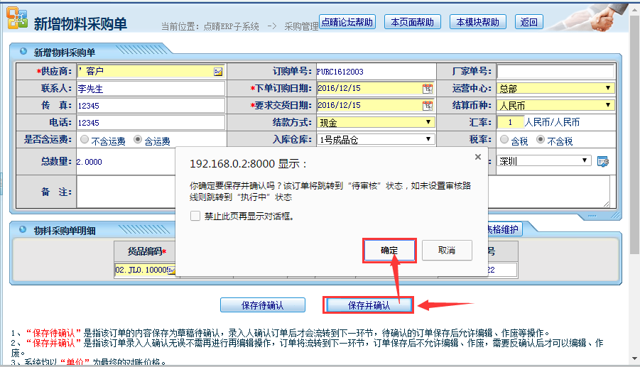 操作步骤: 采购管理——新增采购单,如下图: 操作步骤说明: 1、点击选择供应商; 2、选择结款方式; 3、选择入库仓库; 4、选择采购产品编号; 5、用扫码枪键入批号(串码) 完成后,点击保存并确认,如下图所示: 完成后,相关审核人会收到对应的审核提醒邮件; 操作步骤:采购单——采购单审核,如下图所示, 审核完成后,完成操作,仓库即刻增加该库存数量,如下图所示: 点晴模切ERP更多信息:http://moqie.clicksun.cn,联系电话:4001861886 该文章在 2016/12/15 9:13:31 编辑过 |