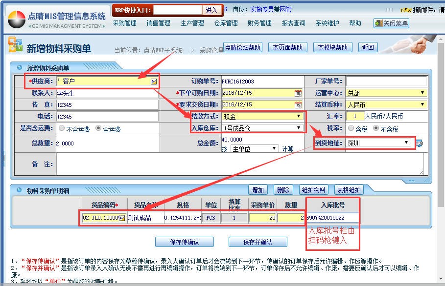 点晴模切ERP、JXC扫码新增采购单操作(扫码枪录入批号)