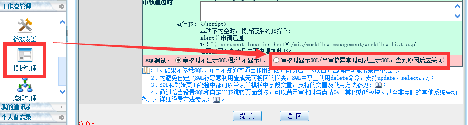 出现这个错误的原因是你启用了这个流程表单模板的高级开发设置,增加了申请、审核通过或不通过时执行某个自定义SQL操作,而你的SQL语句中有错误,导致了不管是这个工作流的申请、还是审核都会被错误拦截,而无法正常进行下去!