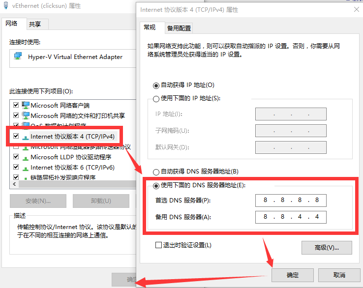 步骤三:在弹出的属性对话框内,单选下面的“使用下面的DNS服务器地址",并分别填入: