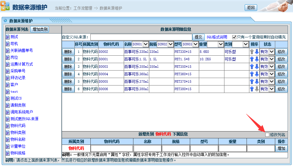 进入工作流自定义SQL数据源界面,勾选“修改列名”: