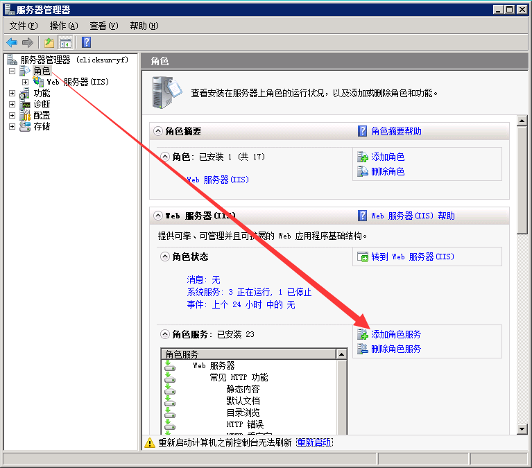 在导航窗格中,展开“角色”,右键单击“Web 服务器(IIS)”,然后单击“添加角色服务”: