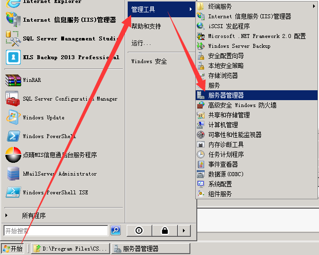 依次单击OA服务器“开始”、“管理工具”和“服务器管理器”: