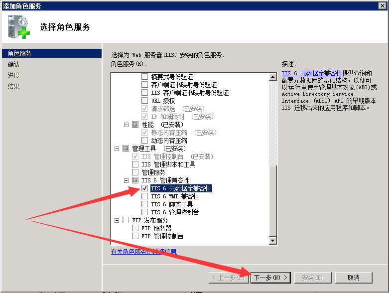 选中“IIS 6 元数据库与 IIS 6 配置的兼容性”及“IIS 6 管理控制台”所对应的复选框。
