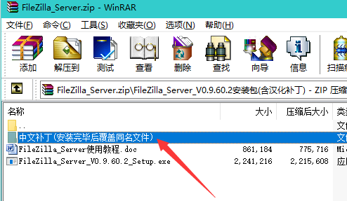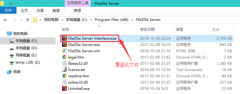 1、FileZilla Server完成安装后,将下载到的安装文件中的中文补丁解压到FileZilla Server的安装目录,覆盖同名文件,完成软件的中文汉化处理。