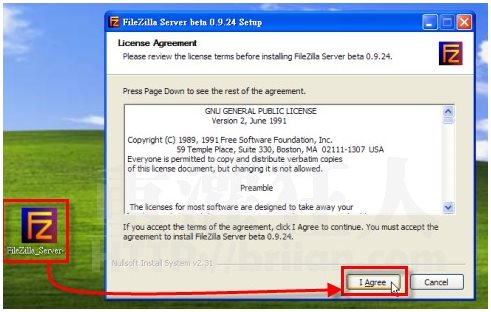 第1步、在上面下载filezilla_server。然后在「FileZilla_Server_V0.9.60.2_Setup.exe」安装程序上双击鼠标左键,执行安装程序,接着再点击一下〔I Agree〕按钮,开始安装。
