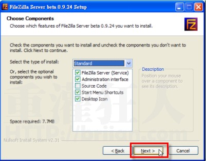 第2步、接着会问你要安装哪些组件,安装方式:默认的标准,按一下〔Next〕继续下一步。