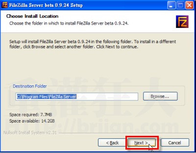 第3步、接着他会问你要将FTP服务器程序安装到哪个文件夹去,强烈推荐安装到非默认路径,以增加安全系数。请按一下〔Next〕按钮,继续下一步。