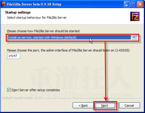 第4步、此步骤是询问我们是否要让FTP服务器在电脑开机时自动启动,请点选【Install as service, started with Windows (default)】,再按一下〔Next〕。这样FTP服务器便会自动被安装成系统的Service服务,每次开机后便会自动在后台中启动并执行FTP服务器的功能。设置管理端口“14147”,强烈推荐修改此端口,例如:改成38121端口。(注意不要和常见服务如80端口冲突)