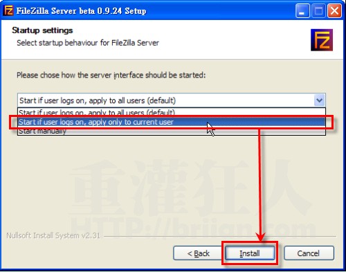 第5步、接着我们可以设定是否在开机时自动启动「FileZilla Server Interface」服务器管理界面,如果你常常需要管理你的FTP服务器,可以选【Start if user logs on, apply only to current user】。一般来说都是选最下面的【Start manually】,要用时再手动开启即可。