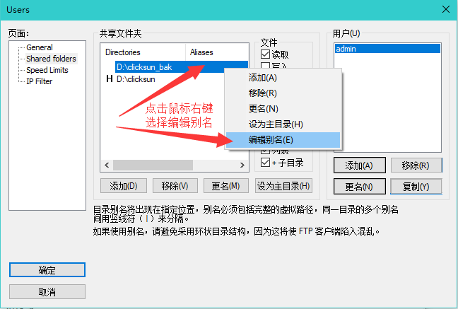 除了主目录外的其他目录都需要增加别名,点击鼠标右键选择编辑别名: