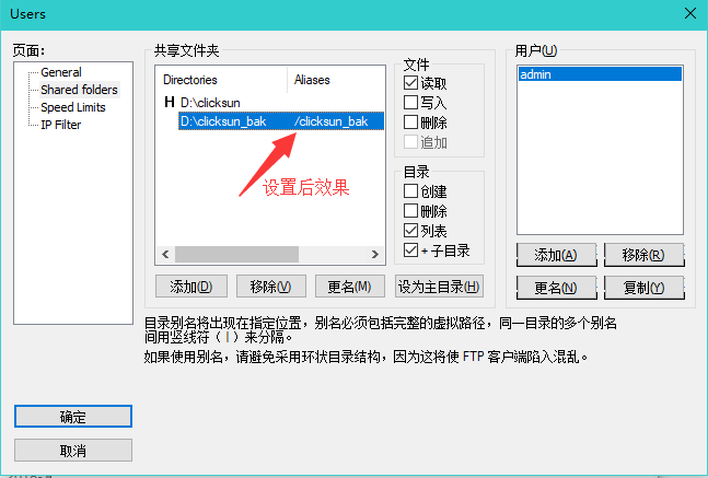 6、在FileZilla Server左侧的【页面】控件树中点击【Shared folders】,在【共享文件夹】区域中点击【添加】按钮,选择一个文件夹作为FTP的共享文件夹,然后点击【设为主目录】按钮,将该目录设置为主目录。最后点击窗体下方的【确定】按钮,完成配置。
