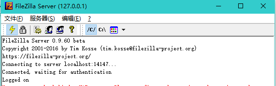 3、启动FileZilla Server的主界面,如果出现平【Logged on】或【Server online】的字样,表示已经顺利上线。点击菜单中的闪电图标切换上线、离线,即可手动开启或关闭FTP服务。