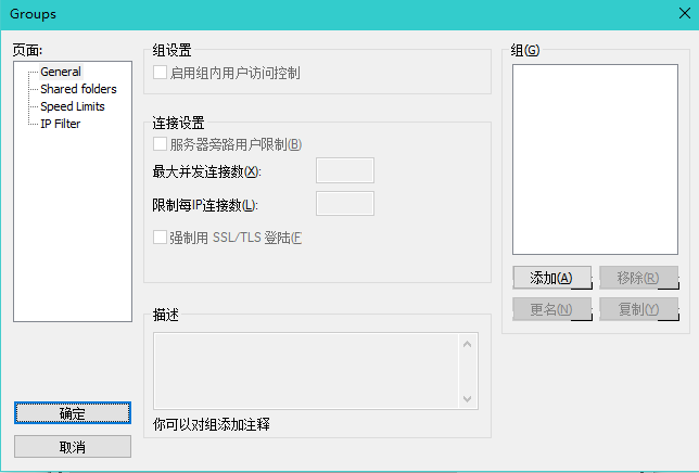 6、可以限制总用户数、单个IP连接数,不同用户可以设置不同的用户数限定以及不同的速度限制,也可以应用组设置注意:请不要轻易更改管理员登陆端口,因为端口错误您将无法正常登陆,从而无法看到正确的管理登陆端口,如果您一定要更改此端口,请记下修改前和修改后的端口,以防无法开启服务而导致重新安装本服务器!