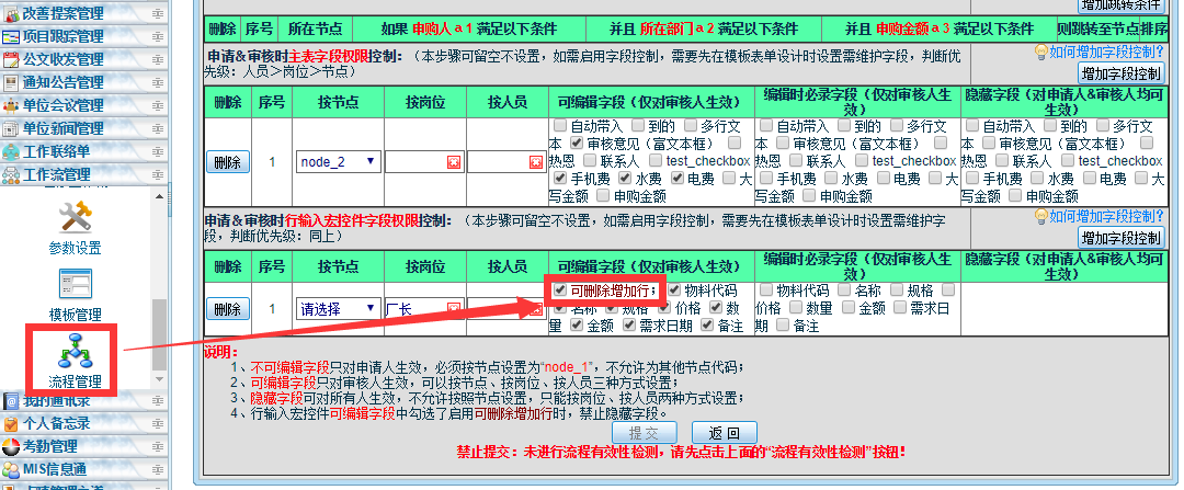 ![]() 使用方法,进入流程设计管理界面: ![]() 在“可编辑字段”中,可以看到有一个“口可删除增加行”的项目,勾选后,前面指定的审核人就可以在审核时,动态删除行输入宏控件中的行次或新增行次了。 注意,勾选了这个项目后,隐藏字段就会自动失效,也即不允许隐藏任何字段。 另外,勾选了这个项目后,审核人在编辑时,删除的行次信息就会被彻底删除,无法找回申请人填写的内容! 该文章在 2019/1/23 17:25:29 编辑过 |