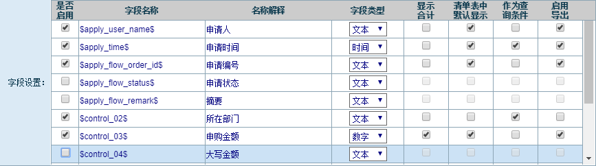 ![]() 上图的前5行是固定字段,后面control开头的则是从所选流程模板中取出的字段,可以在“模板设计页面-控件设定” 勾选“导出字段”,勾选后会如上图出现在设置页面: