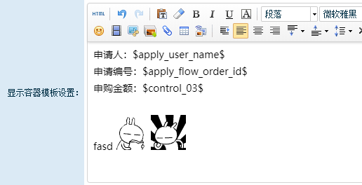 ![]() “显示容器模板设置”,就是申请人点击上图列表的时候,系统会把模板中的$xxx$字符换成真实信息,显示在申请页面上。