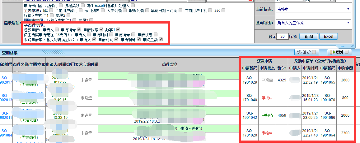 勾选“作为查询条件”的字段会在子流程现在页面显示查询条件。