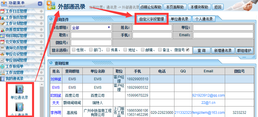 说明:单位通讯录、个人通讯录、外部通讯录,均支持增加自定义字段。