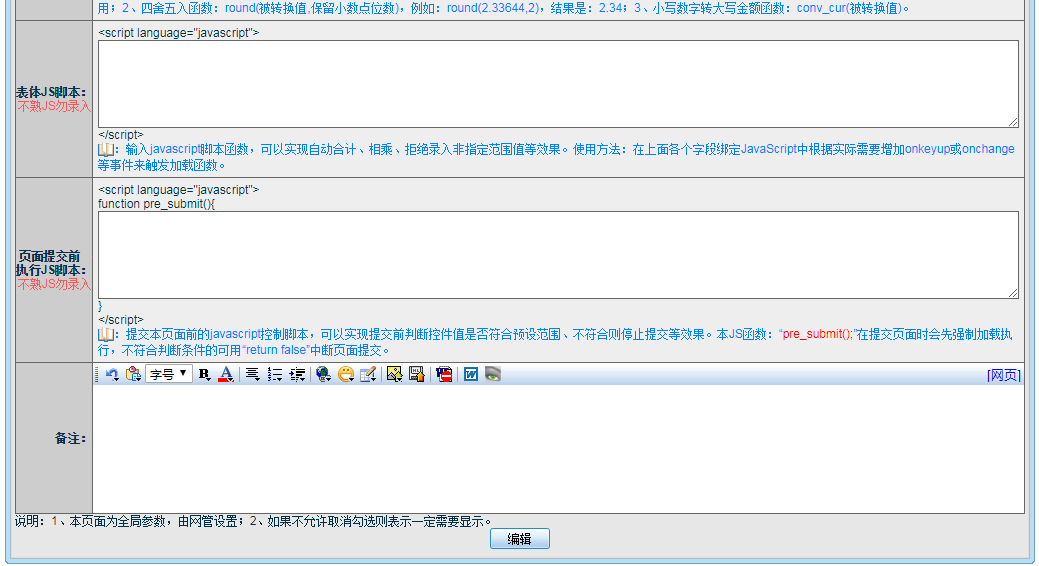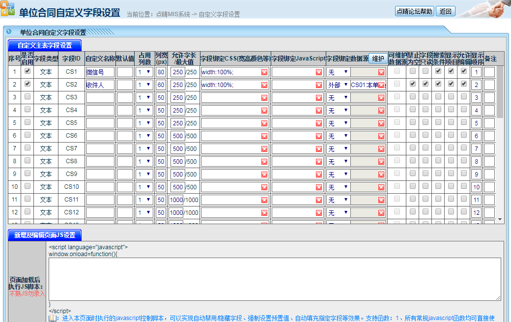 请仔细观察以上界面,可以设置增加的字段类型、长度、绑定CSS和JS、设置只读、是否允许编辑等,并且可以在页面上设置各种JS效果,实现各种需求: