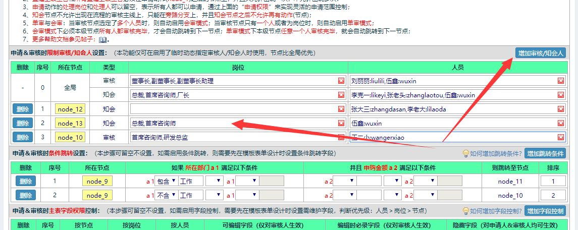 :工作流中如何给自由流程和固定流程动态增加节点设置指定范围的审核人、知会人和归档人?