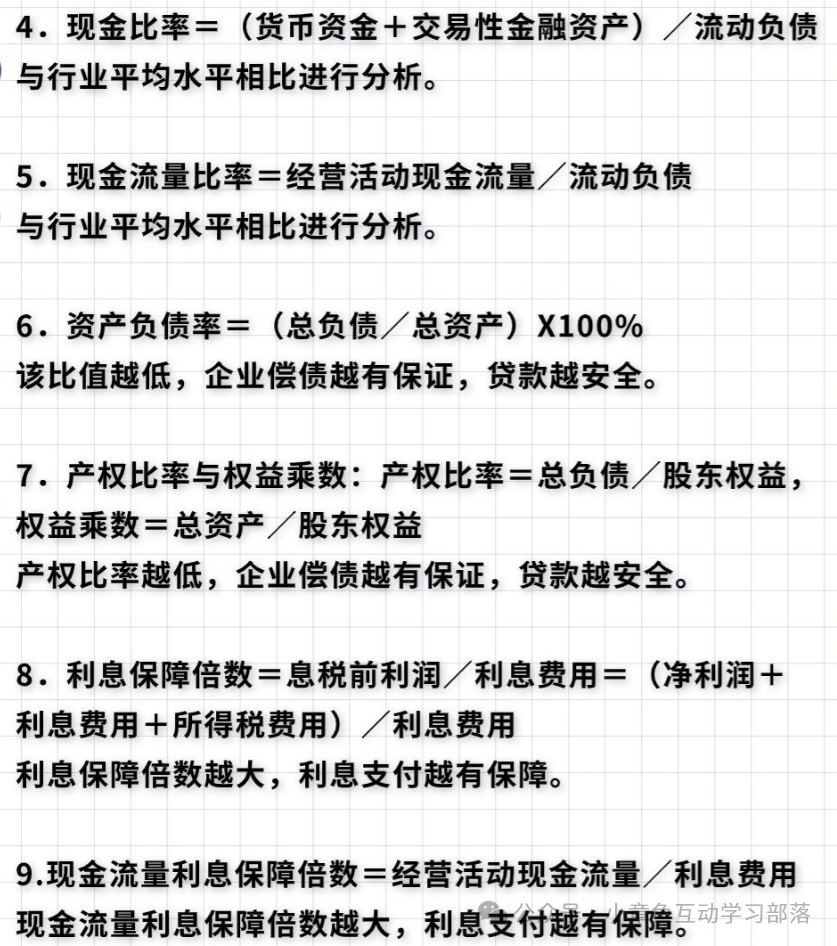 一、什么是财务分析? 企业财务分析是对企业的财务状况和经营成果进行评价,并对企业未来经济前景进行预测,进一步提出建议以提升财务状况和经营成果。根据评价的范畴、深度和目的的不同,财务分析可以分为狭义和广义两种。 狭义财务分析即财务报表分析,以会计核算和报表资料为依据,对企业等经济组织过去和现在有关的筹资活动、投资活动、经营活动的绩效进行分析与评价。 广义财务分析在财务报表分析之外还包括大量财务经营分析,即借助企业经济活动所提供的资料,对企业各种资源的配备、使用情况和经济效益进行分析和评价,以不断寻求提高经济效益的途径。 二、常用的财务分析方式及公式: 一).偿还债能力分析 偿债能力是现代企业综合财务能力的重要组成部分,是企业经济效益持续增长的稳健性保证。因此,重视并有效提高偿债能力,不仅是维护债权人正当权益的法律约束,而且是企业保持良好市场形象和资信地位,避免风险损失,实现企业价值最大化目标的客观需要;不仅是企业走向市场并在瞬息万变的市场竞争中求得生存与发展的先决条件,而且是增强企业的风险意识,树立现代市场观念的重要表现。 (一).常用计算公式: 1.净运营资本-流动资产-流动负债-长期资本-长期资产对比企业连续多期的值,进行比较分析。 2.流动比率-流动资产/流动负债与行业平均水平相比进行分析。 3.速动比率-速动资产/流动负债与行业平均水平相比进行分析。