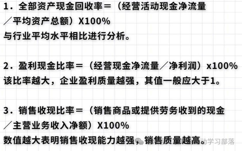 三).盈利质量分析 盈利质量分析主要是根据经营活动现金流入量与销售收入、净利润等之间的关系,揭示企业保持现有经营水平,以及将来创造盈利能力的一种分析方法。分析企业的盈利质量指标主要有销售净现率、净利润现金比率和现金毛利率。 (一).常用计算公式: