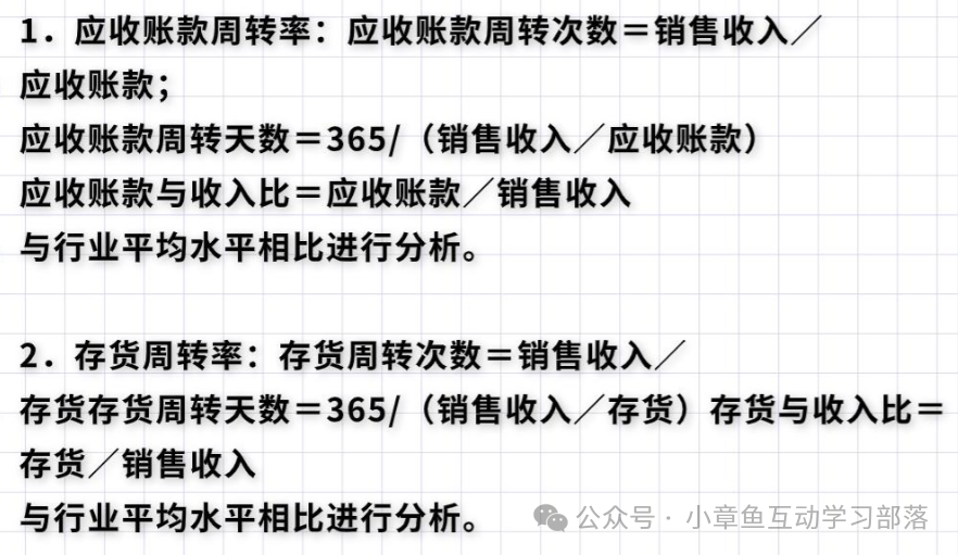四).营运能力分析 营运能力是指通过企业生产经营资金周转速度的有关指标所反映出来的企业资金利用的效率,它表明企业管理人员经营管理、运用资金的能力。企业生产经营资金周转的速度越快,表明企业资金利用的效果越好、效率越高,企业管理人员的经营能力越强。 反映企业营运能力的财务指标主要有: 1.应收账款周转率;2.存货周转率;3.资产周转率。 (一).常用计算公式:
