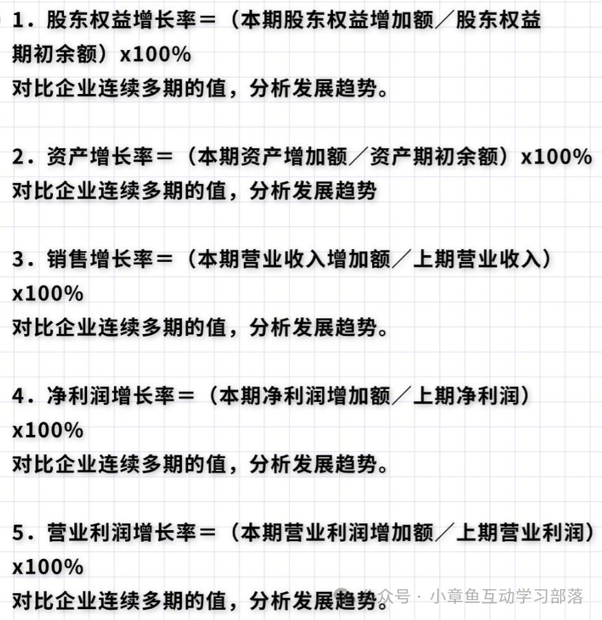 五).发展能力分析 企业的发展能力,也称企业的成长性,它是企业通过自身的生产经营活动,不断扩大积累而形成的发展潜能。企业发展能力衡量的核心是企业价值增长率。企业能否健康发展取决于多种因素,包括外部经营环境、企业内在素质及资源条件等。 (一).常用计算公式: