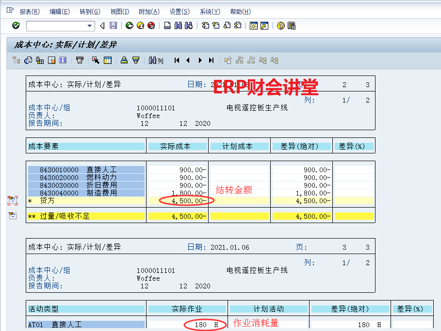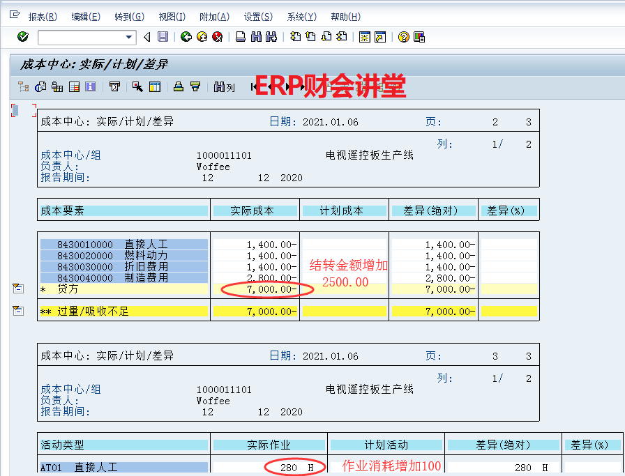 接下来CO11N对订单4010000008进行报工。报工完成后,KOB1再次查看订单成本明细如下。订单4010000008增加了2500.00制造成本,分别为直接人工、燃料动力、折旧费用和制造费用,与报工时确认的作业相对应。S_ALR_87013611再次查看生产成本中心费用如下:可以发现,生产成本中心的作业消耗量增加了100,结转金额增加了2,500.00。相当于报工的同时,CO自动从成本中心结转成本到生产订单,金额为报工量乘以作业单价。事实上,订单成本是一个动态变化的过程,随着业务的发生而实时更新。例如,生产投料后,成品入库后,报工后,KOB1查看到的数据都不一样。如果能够把工单流程走一遍,观察每一步对成本的影响,有利于掌握SAP的成本核算。点晴模切ERP更多信息:http://moqie.clicksun.cn,联系电话:4001861886