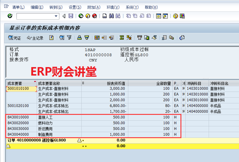 可以发现订单余额为2,500.00,成本中心作业消耗量为180,结转成本为4,500.00。