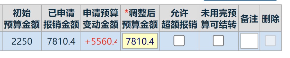 例如初始2250,第一次预算调整输入3000,此时预算增加了750,并不是预算增加3000,第二次调整想要把报销金额2500加进去,调整后预算金额应该填5500。